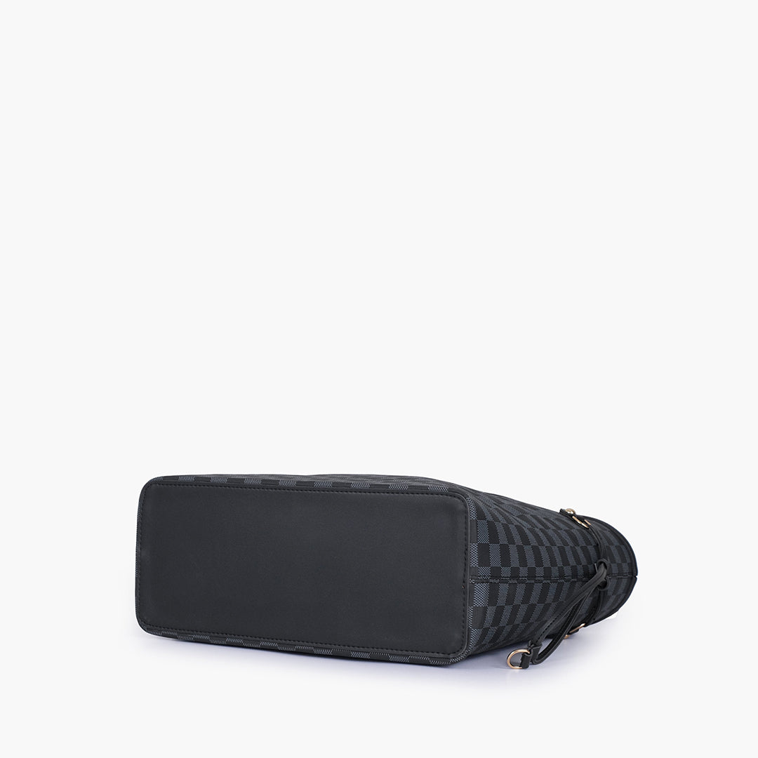 Width (top): 17.5 inches Width (bottom): 12.5 inches Height: 12 inches Depth: 5 inches One main compartment with hook closure One inside zipper pocket Material: Faux leather.