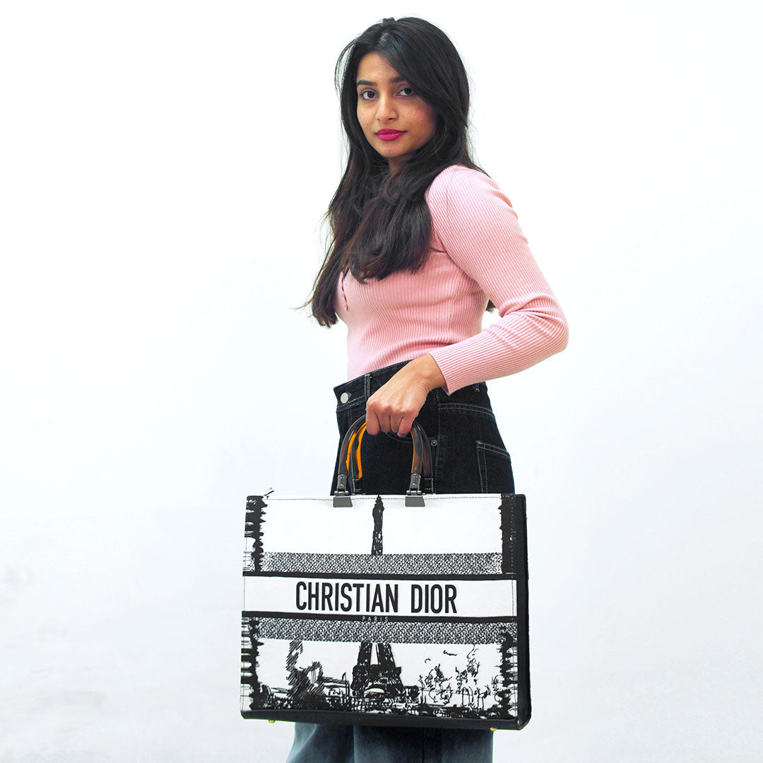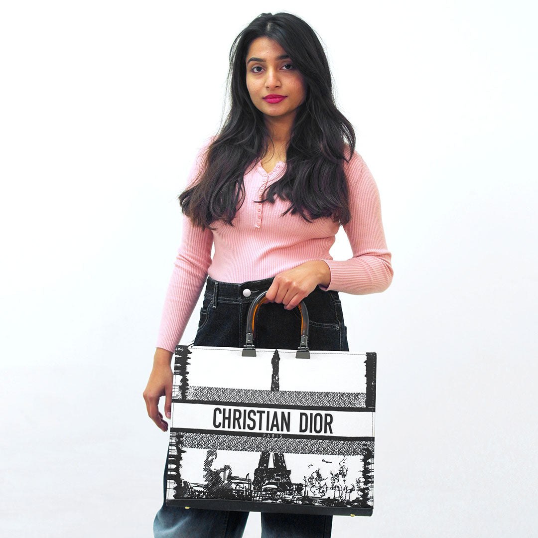 Imported Pu Leather with Canvas Length: 12.5 Inches. Width: 14 Inches. Signature Dior Toile De Jouy Pattern Spacious Interior for Everyday EssentialsSturdy Stylish Handles for Comfortable Carrying Iconic Christian Dior Logo...
