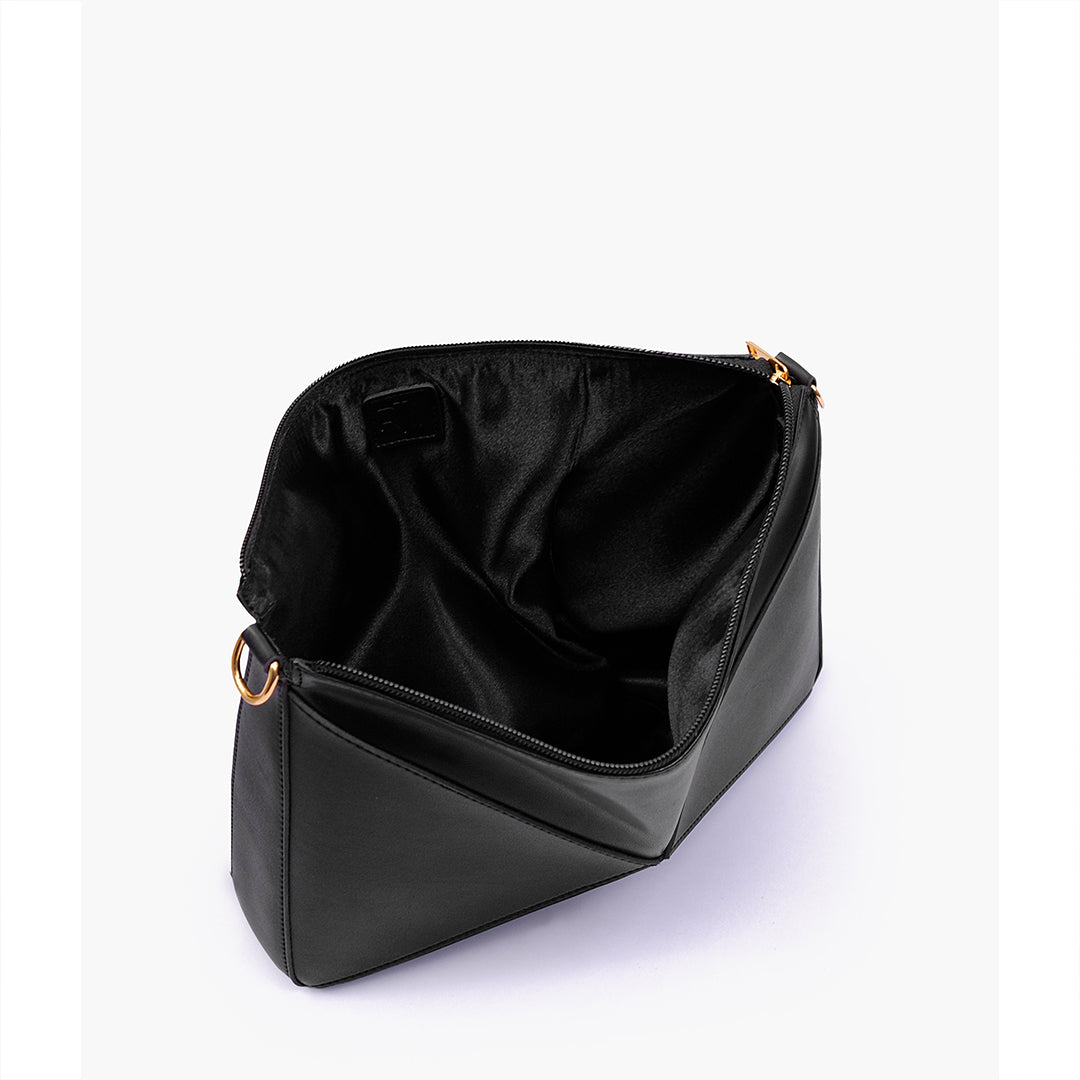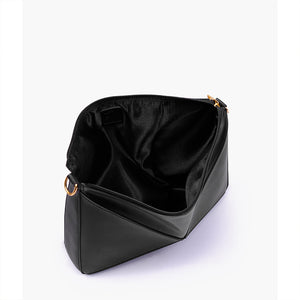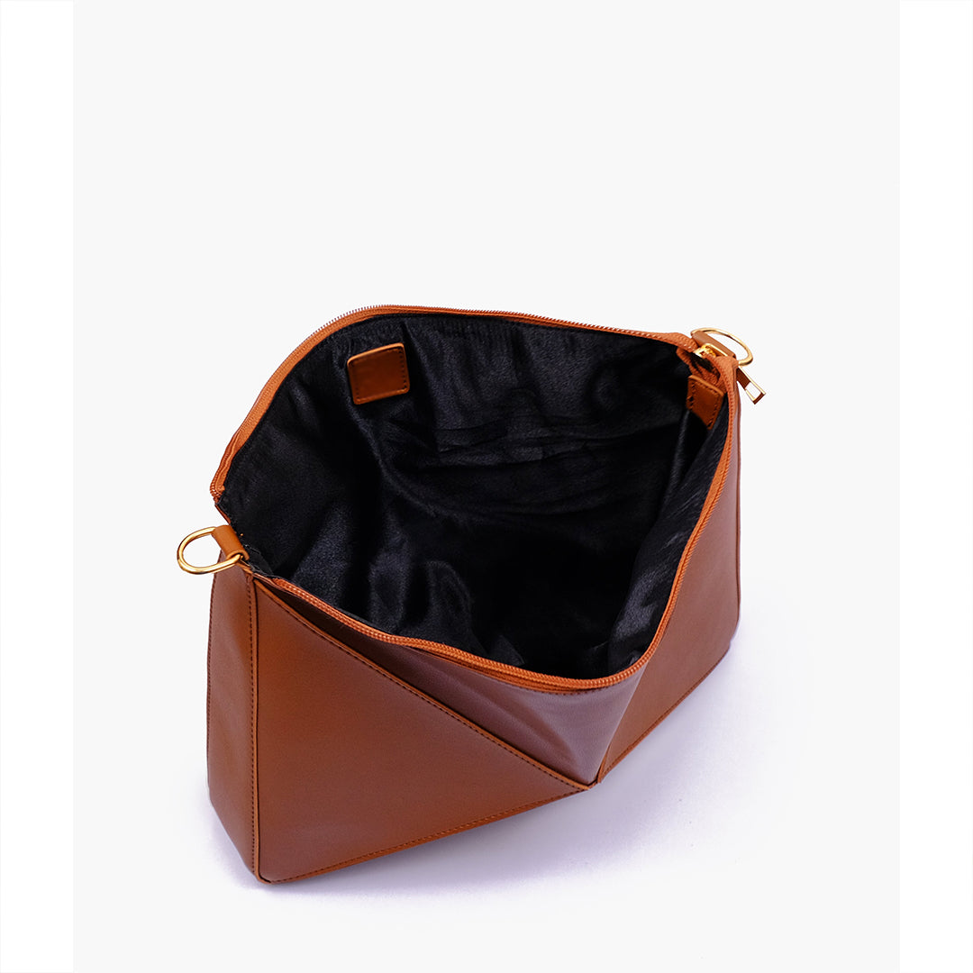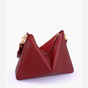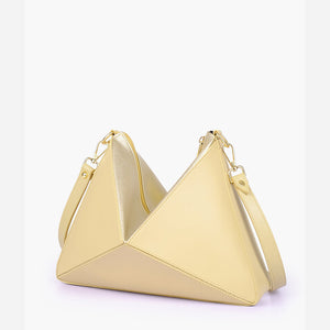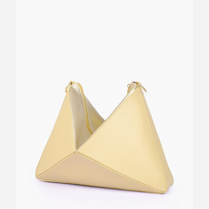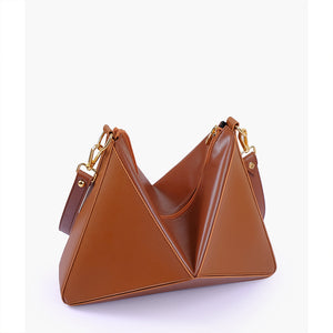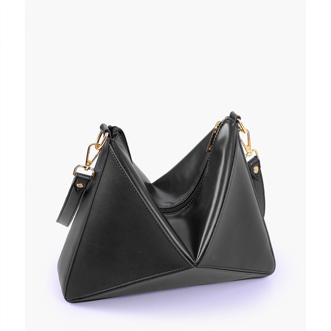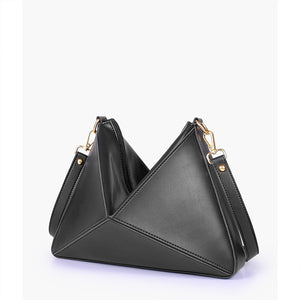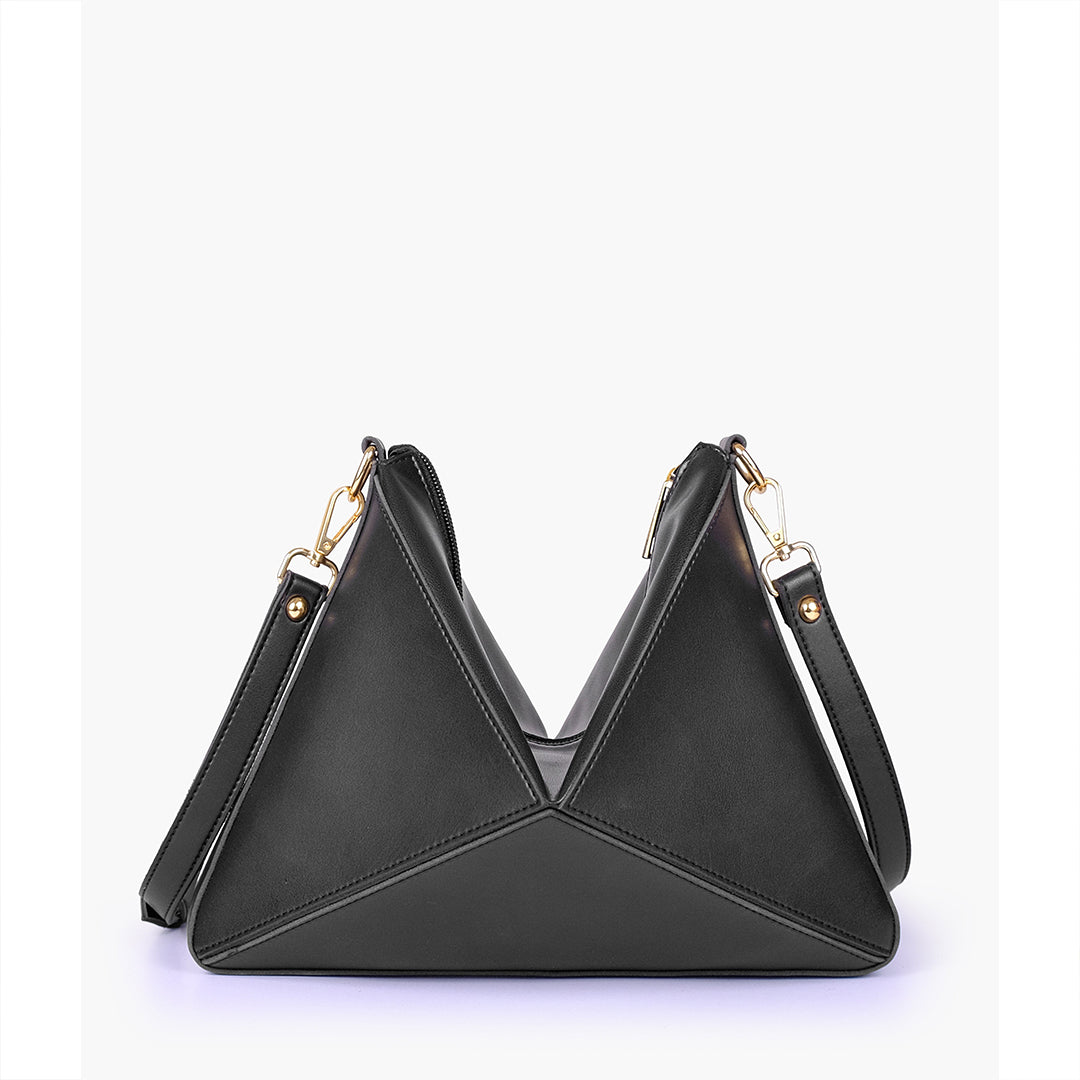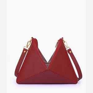 IMPORTED PU LEATHER Width: 11.5 inches Height: 9 inches Depth: 2.2 inches Eye-catching triangular design for a modern, bold statement. One main zipper compartment. Flexible panels allow for expansion, contraction, or...