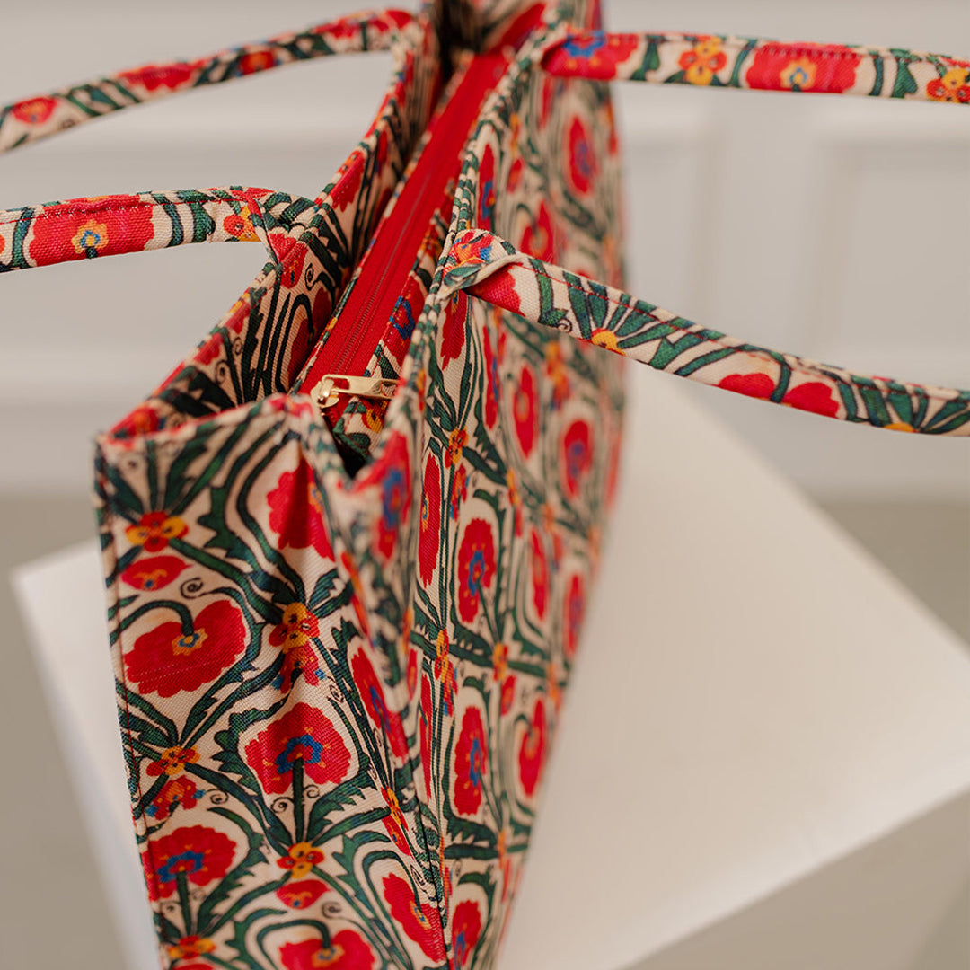 Imported high class canvas Big size 13.5 × 16 inches One main zip closure One inner zip pocket Shoulder handle also Fine quality stuff Available in different colors